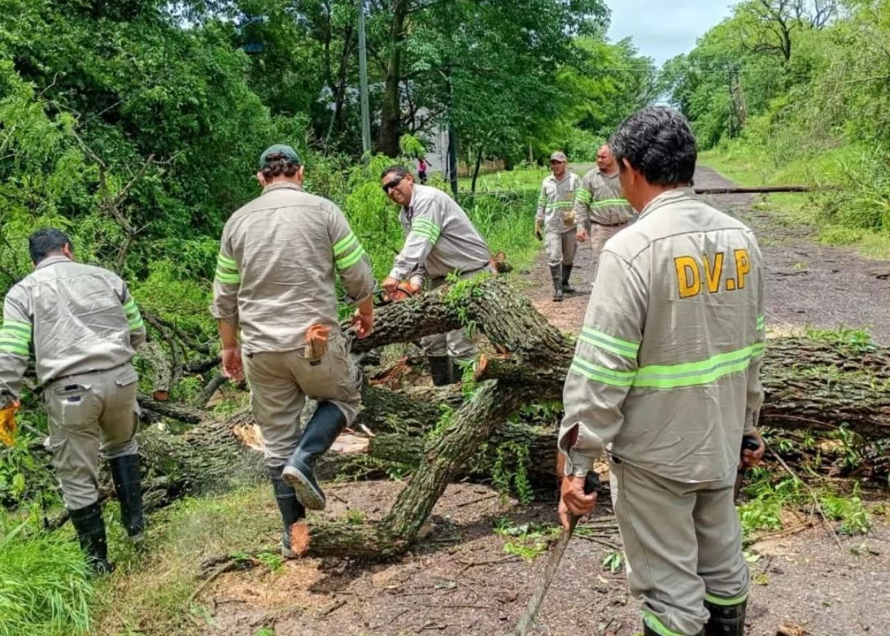 Se encuentran trabajando en la remoción de árboles, ramas y postes caídos, así como también en el despeje de accesos principales y caminos vecinales para reestablecer la circulación y facilitar el ingreso de los servicios esenciales.